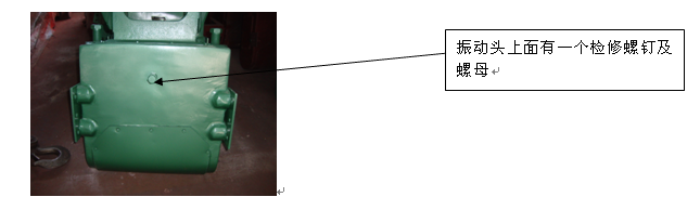 (2.2):松檢修螺釘。 將殼體上下面聯(lián)接叉定位螺釘即檢修螺釘松開(kāi)≥10mm左右后將螺母拼緊。如圖示在振動(dòng)器的上面有一個(gè)檢修螺釘,振動(dòng)器的下面有成三角形的三個(gè)檢修螺釘。