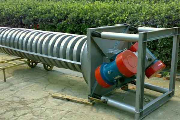 - ZC垂直振動輸送機的驅動裝置振動電機安裝在輸送塔下部,兩臺振動電機對稱交叉安裝,輸送塔由管體和焊接在管體周圍的螺旋輸送槽組成,輸送塔座于減振裝置上,減振裝置由底座和隔振彈簧組成。